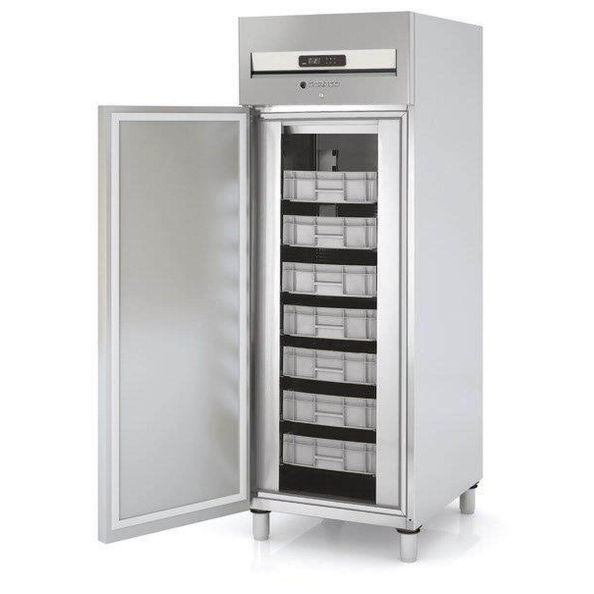 Armoire à casiers (poissons, viandes ou légumes) – Température positive (-4°/+4°C) – Capacité 610l – 1 porte pleine – Extérieur en inox AISI-304 18/10 (sauf partie arrière) – Intérieur en inox AISI-304 – Evaporateur anti-corrosion et compresseur hermétique ventilé – Thermostat électronique avec affichage digital – Arrêt de la ventilation à l’ouverture de la porte – Système de récupération individuelle des eaux de chaque bac – Eclairage intérieur LED – Serrure en standard – Pieds inox réglables de 125 à 200mm – Ambiance 43°C – Dotation : 7 bacs avec fond perforé inox 400x600x120 mm