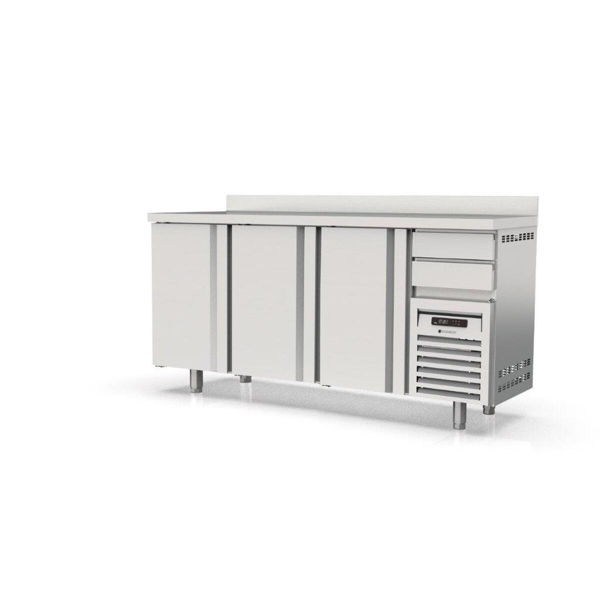 ARRIÈRE BAR – Température -2°/+8°C – 3 portes pleines + 2 tiroirs neutres sur groupe – Capacité 540L – Extérieur et intérieur en inox AISI-304 18/10 (sauf partie arrière en galva) – Dosseret de 100mm (sans dosseret sur demande) – Thermostat électronique avec afficheur digital, spécial économie d’énergie – Evaporation automatique des eaux de dégivrage – Porte emboutie et réversible – Charnières inox – Joint de porte déclipsable – Evaporateur ventilé traité anti-corrosion et condenseur ventilé et extractible – Pieds inox réglables (hauteur meuble possible 900) – Livré avec 2 clayettes rilsan par porte réglable en hauteur sur support inox – Ambiance 40°C – Alarme haute et basse température sur contrôleur digital