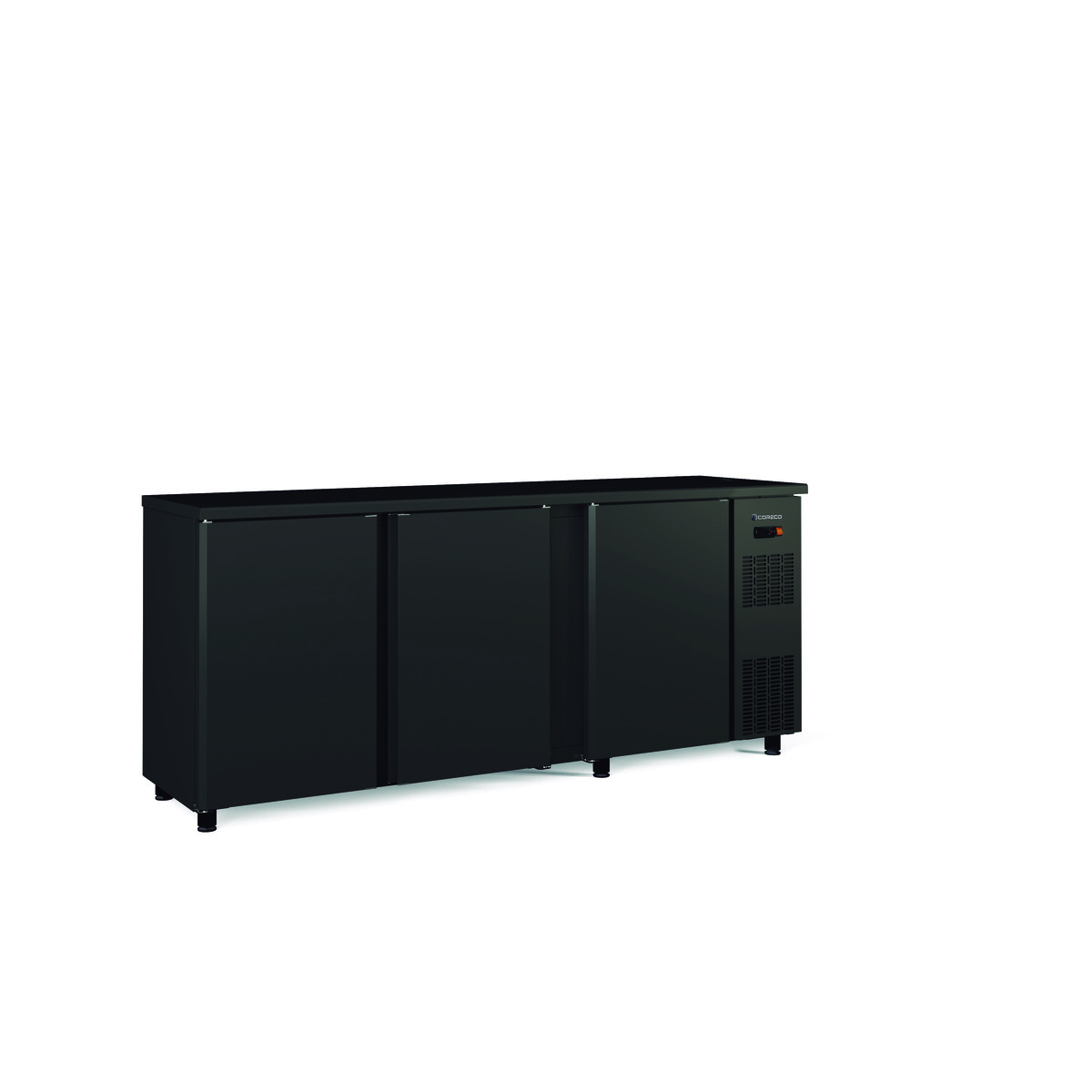 Arrière bar – Température +2°/+8°C – 3 portes pleines battantes – Stockage : 500 bouteilles (33cl) – Capacité : 490l – Extérieur en acier galvanisé plastifié noir – Intérieur en acier plastifié gris – Eclairage intérieur LED – Serrure en standard – Thermostat électronique avec afficheur digital, spécial économie d’énergie, protégé des projections – Compresseur hermétique ventilé – Evaporateur et condenseur ventilés – Evaporation automatique des eaux de dégivrage – Alarme haute et basse température sur contrôleur digital – Pieds réglables pour obtenir une hauteur de 880 mm (inclus) – Livré avec 2 clayettes rilsan réglables en hauteur