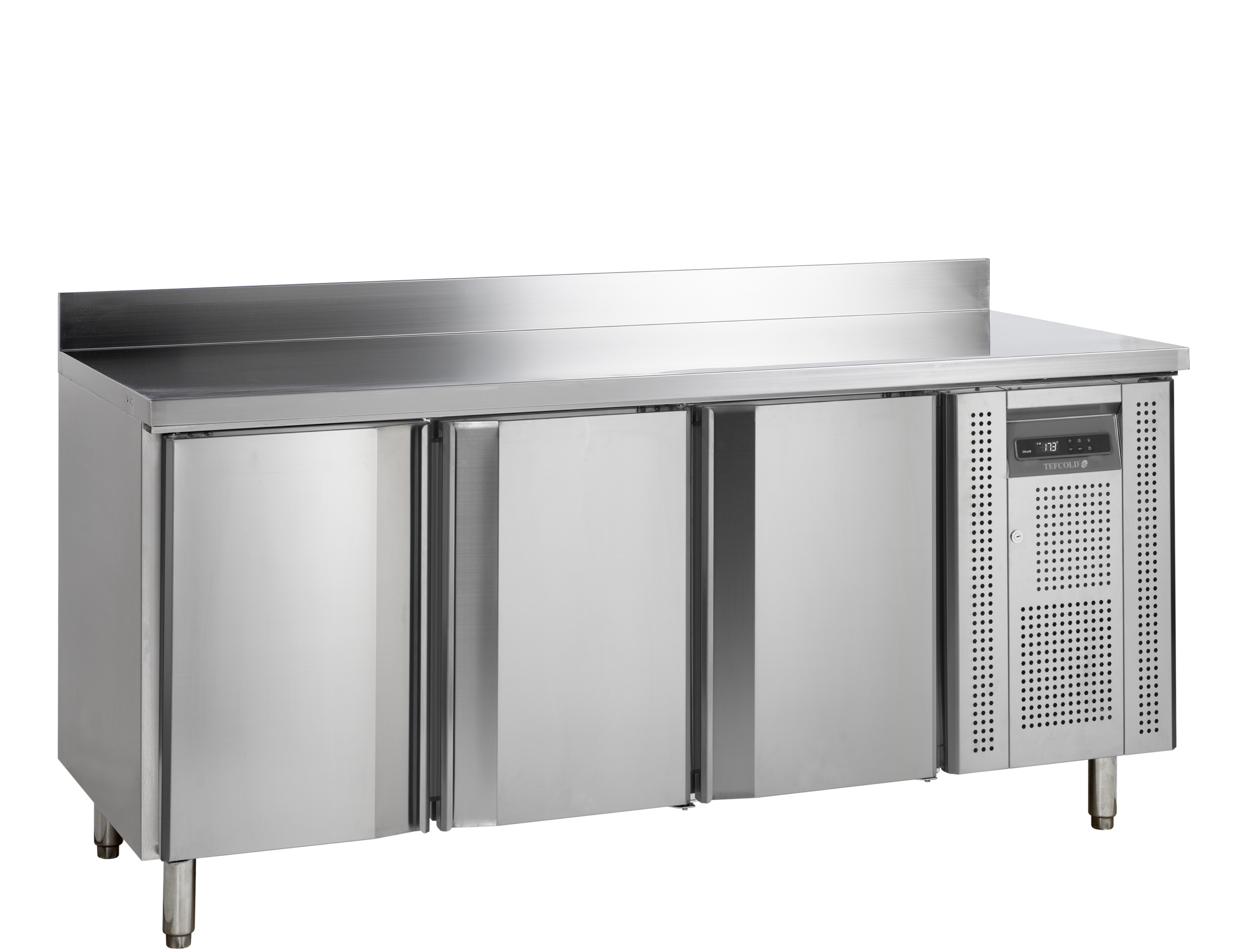 Nouveau design|Acier inoxydable|Refroidissement ventilé|Dégivrage automatique|Portes à fermeture automatique|Dessus de table amovible avec dosseret|Pieds ajustables