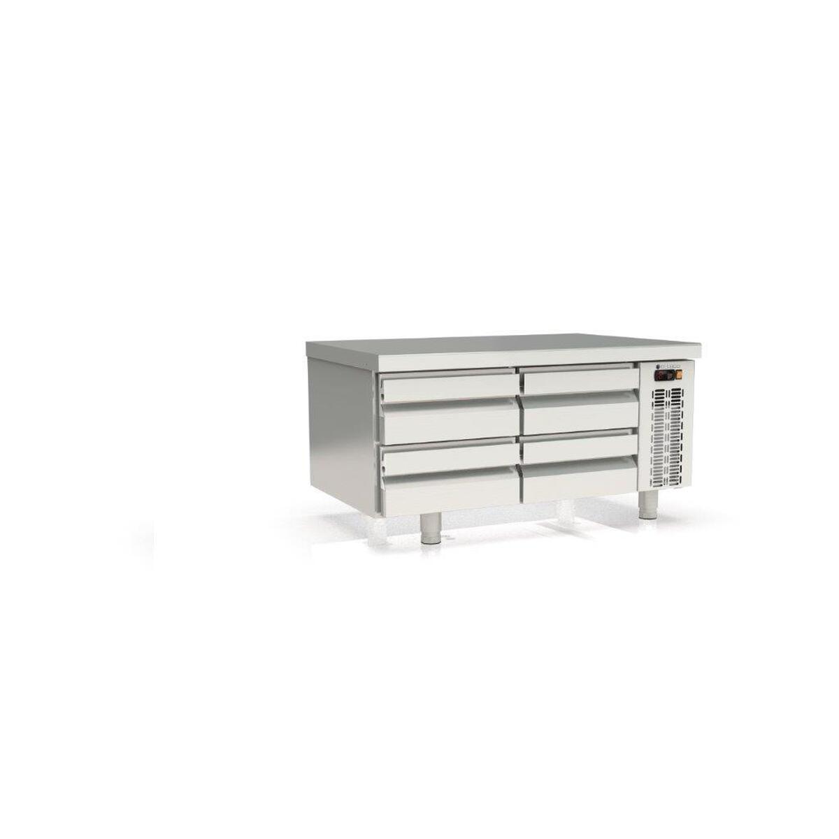 Meuble – Série soubassement GN1/1 Hauteur 600 – Température -2°/+8°C – 2×2 tiroirs GN1/1 prof. 100 + évaporateur entre les portes – Capacité 4 bacs GN1/1 – Extérieur et intérieur en inox AISI-304 18/10 (sauf partie arrière en galva) – Pieds inox réglables (90 à 125mm) – Tiroirs réfrigérés démontables en inox sur glissières télescopiques avec système d’auto-fermeture – Idéal pour poser de petits éléments de cuisson longueur 400mm, sous vide, trancheur… – Thermostat électronique avec afficheur digital, spécial économie d’énergie – Compresseur hermétique ventilé sur glissières – Evaporateur ventilé traité anti-corrosion – Evaporation automatique des eaux de dégivrage – Ambiance 40°C – Alarme haute et basse température sur contrôleur digital