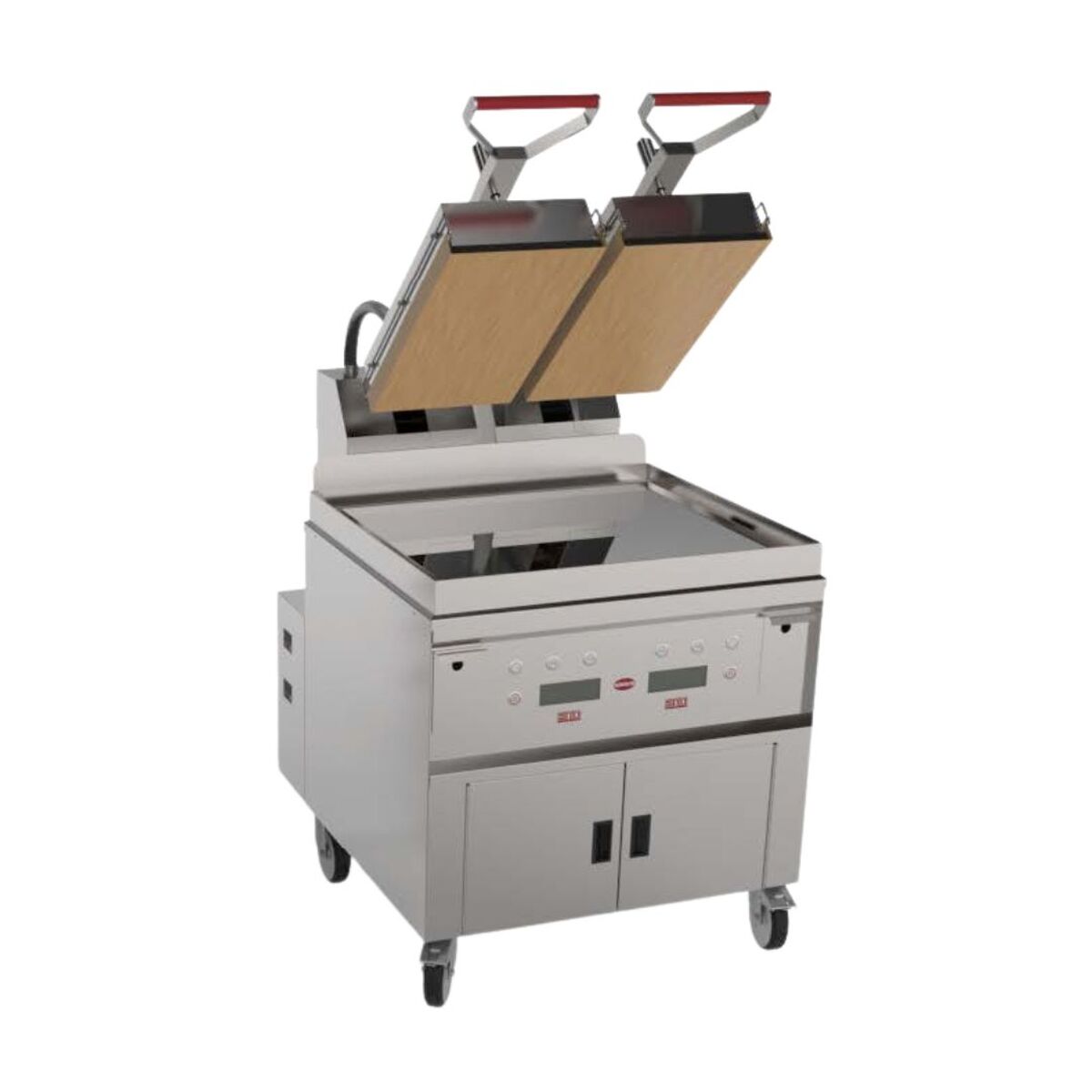Plaque au chrome électrique – Zone de chauffe : 700×600 + 2 presses 285×565 – Puissance : 20 kW – Carrosserie entièrement inox AISI-304 – 2 x 9 programmes de cuisson automatiques – Cuisson ultra-rapide : réduction du temps de cuisson de près de 50% – T° d’utilisation : min. 150° / max. 232°C – Plaque inférieure recouvert de chrome dur de 50 microns – Contrôleur électronique qui pilote la température et le temps de la plaque inférieure et supérieure – Relevage automatique en fin de cuisson avec signal sonore – Livré sur socle avec 4 roulettes dont 2 avec freins – 2 tiroirs à graisse avec une capacité de 5,3 litres – LIVRÉ AVEC TAPIS EN TEFLON, PRODUIT DE NETTOYAGE, RACLETTE, BROSSE METALLIQUE ET SPATULE