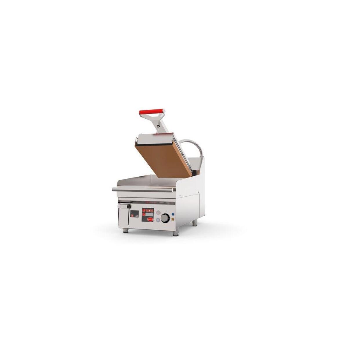 Plaque au chrome électrique avec presse – Surface utile de la plaque : 400×500 + 1 presse 250×450 – Puissance : 8 kW – Carrosserie inox AISI-304 – Plaque avec bain de chrome dur de 50 microns et épaisseur 18 mm – 2 programmes pour la presse – Commandes mécaniques pour la plaque – Commandes électroniques pour la/les presse(s) – Relevage automatique selon le programme – Réduction du temps de cuisson de 50% – Surface anti-adhérentes – Facile à utiliser et à nettoyer – 1 tiroir à graisse avec une capacité de 2 litres – LIVRÉ AVEC TISSUS ANTI-ADHERENT TEFLON, PRODUIT DE NETTOYAGE POUR TEFLON, RACLETTE, BROSSE METALLIQUE ET SPATULE