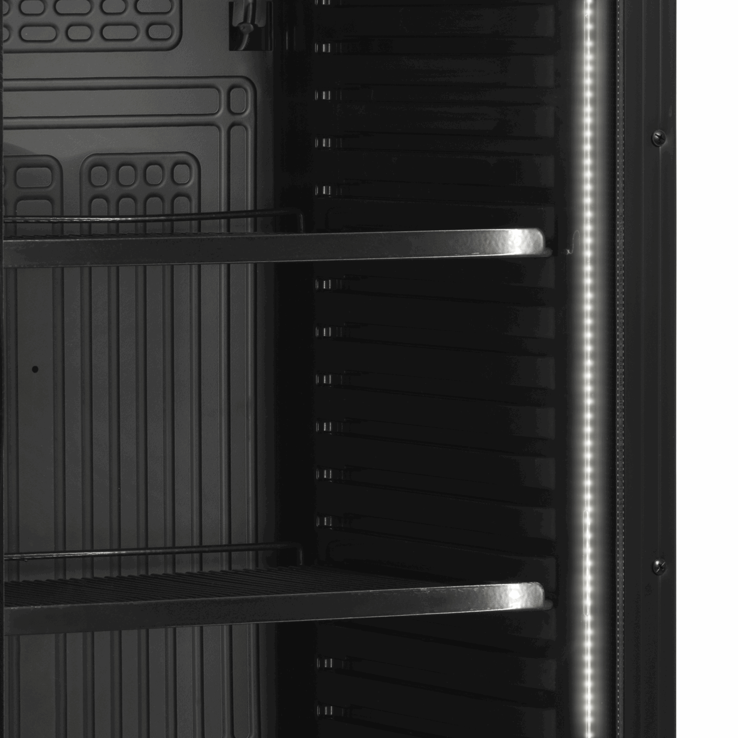 Intérieur/Extérieur noir|Design élégant|Excellente présentation des produits|Possibilité d’ajouter des tablettes|Éclairage LED dans le cadre de la porte|Tablettes ajustables|Refroidissement par ventilateur|Porte réversible (pièces supplémentaires nécessaires)|Verrou