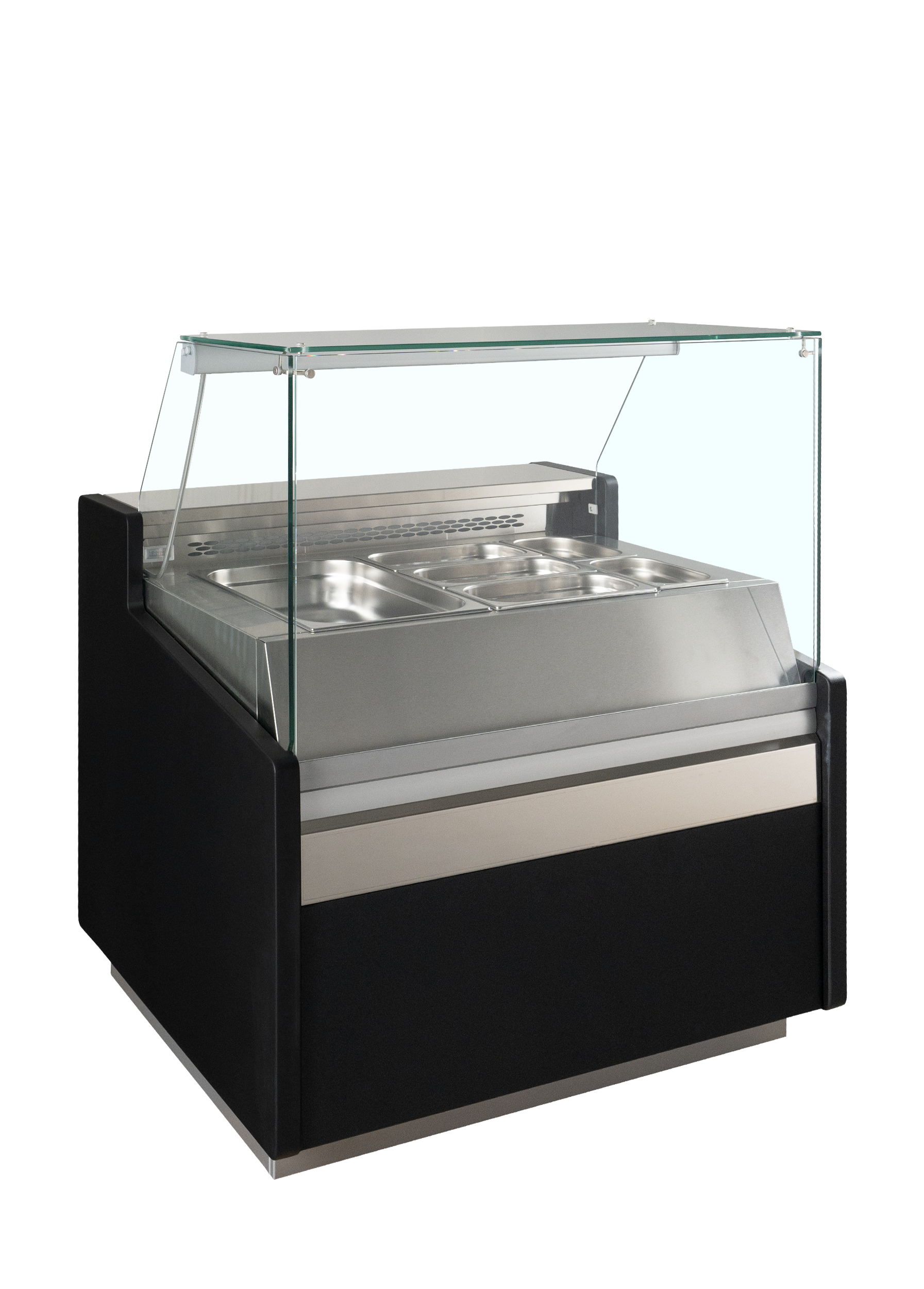Excellente visibilité des produits|Structure en verre pour protéger les aliments|Ouverture vers l’avant sur demande|Accepte les bacs GN1/1 (non fournis)|Compartiment de stockage facile d’accès|Extérieur noir|Refroidissement ventilé|Dégivrage automatique|Éclairage intérieur LED